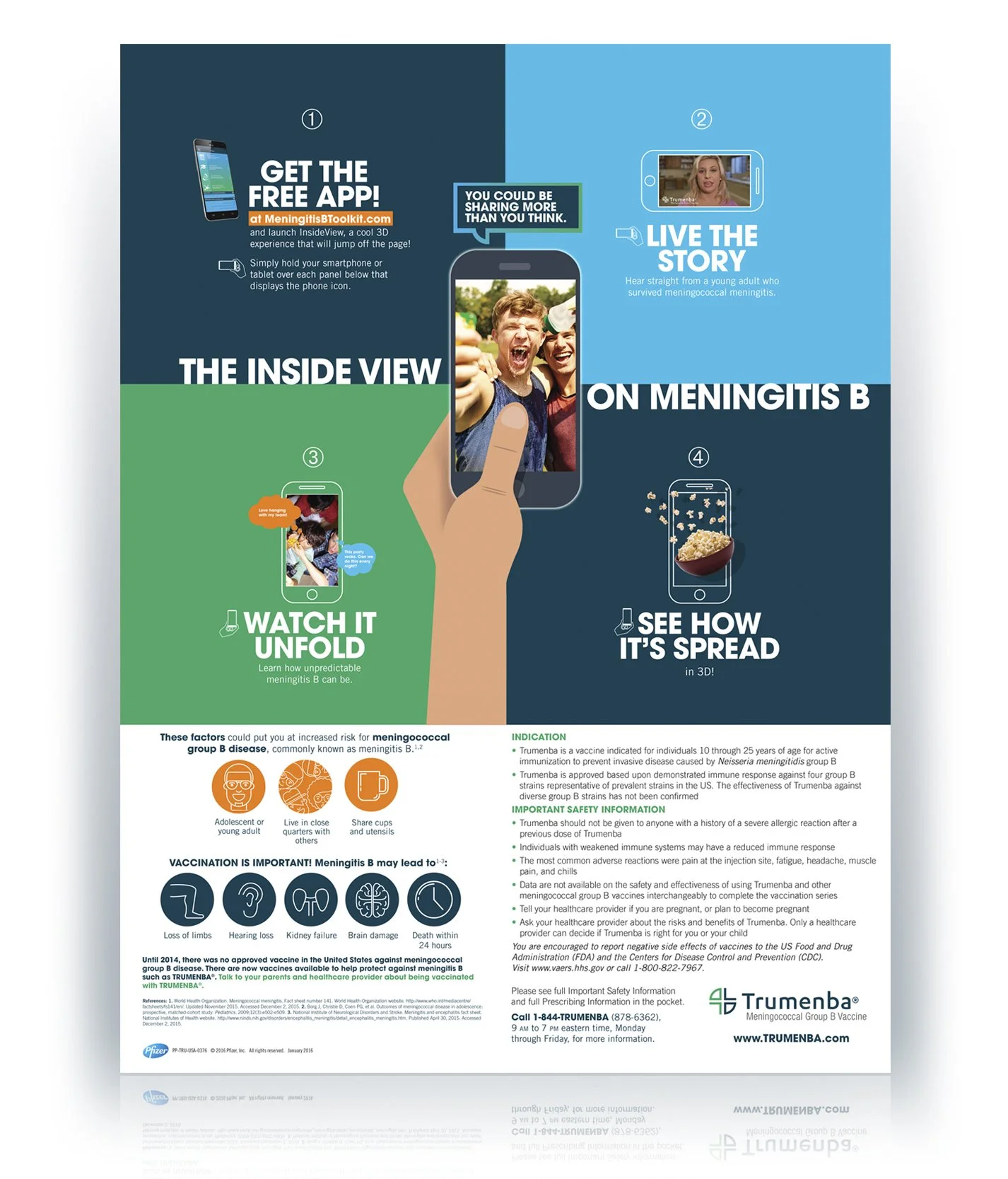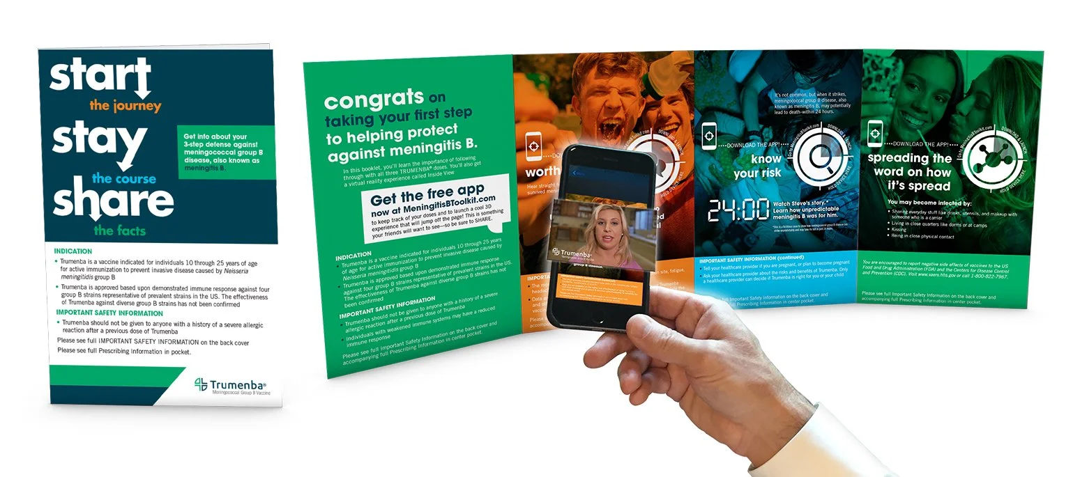 The Trumenba poster and starter kit both use augmented reality launched from an app that users can download to their phone or tablet. Through this 3D experience the user becomes educated about the disease and the risk factors for contracting it.